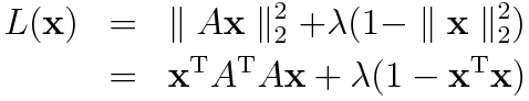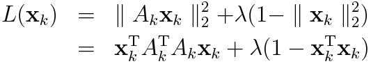 L({\bf x}_k)&=&\parallel A_k{\bf x}_k \parallel _2^2 + \lambda(1-\parallel {\bf x}_k \parallel _2^2)\\
