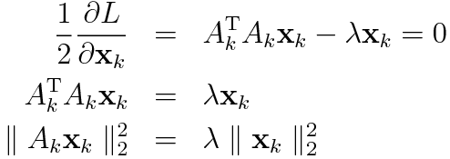 \frac{1}{2}\frac{\partial L}{\partial {\bf x}_k}&=&A_k^{\rm T}A_k{\bf x}_k - \lambda{\bf x}_k = 0\\